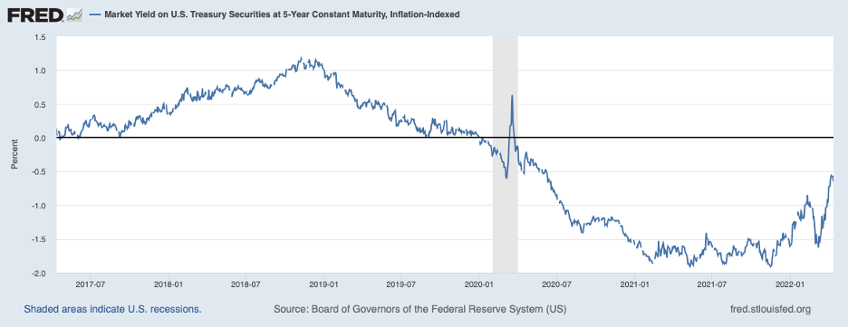 But a federal funds rate of 3.75 percent will not be high enough to break the back of inflation. The next chart shows the real interest rate on a five-year Treasury Inflation Protected Security (TIPS). The real interest rate abstracts from inflation. Note that this yield has risen in recent weeks, in keeping with the two-year yield in the chart above. But the TIPS yield remains in negative territory, implying that market participants foresee real short-term real interest rates staying negative in coming years. As noted in a recent commentary (see, Inflation: When Will it Slow?, April 2, 2022), real short-term interest rates will need to move into positive territory to place inflation on a distinctly downward trajectory. All of this points to the Fed needing to raise the federal funds rate to the vicinity of 5 percent or even higher before we will see a return to low inflation. Helping to restrain demand has been the rise in Treasury yields and other interest rates that has already taken place in anticipation of moderate increases in the Fed’s target for the federal funds rate and run-offs of assets from the Fed’s balance sheet.