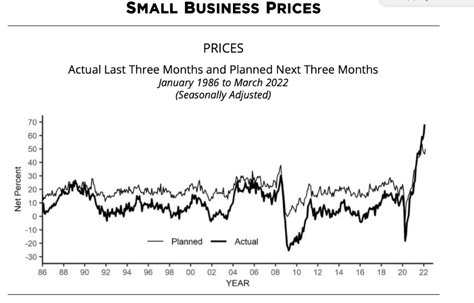 Another indicator of large forthcoming price increases is the March survey of small businesses by the National Federation of Independent Businesses (NFIB). The next chart shows that a very large share of NFIB respondents plan to raise selling prices in the coming three months. The NFIB survey also revealed that inflation was singled out by respondents as the largest problem facing small businesses. The last time inflation was isolated as the biggest problem facing small businesses was forty years ago.