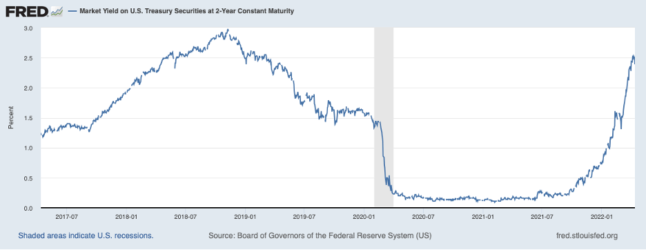 With the forces propelling inflation currently in place, it will take a fairly heavy dose of monetary medicine to turn the path for inflation downward toward the Fed’s 2 percent target. Both the Fed and financial market participants are waking up to this reality. As shown in the next chart, the yield on the two-year Treasury note (which can be thought of as the average level of the overnight federal funds rate expected over the next two years) has risen sharply over recent weeks to above its pre-pandemic level. The most recent reading on the two-year yield implies that the Fed will be raising the federal funds rate from its current level of around 0.33 percent to around 3.75 percent by the end of 2023. Treasury yields for other maturities suggest that market participants do not foresee the federal funds rate going much higher than 3.75 percent before coming down.