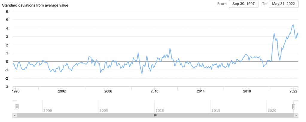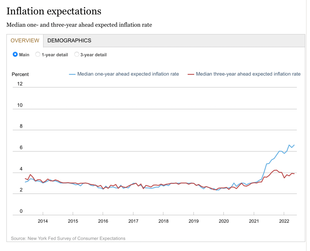 Nonetheless, underlying inflation likely is at least 5 percent, consistent with readings of consumer expectations of inflation from the New York Fed Survey of Consumer Expectations, shown above. This reasoning implies that the target for the federal funds rate will need to rise to at least the area of 6 percent to create the amount of slack that will break the back of current inflation—well above that being contemplated by the Fed and market participants.