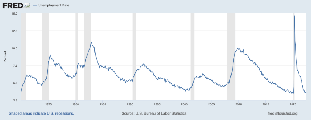 The higher and more deeply inflation is entrenched, the more monetary tightening by the Fed will be needed to bring inflation under control. Because of the inflation momentum that has developed, the tightening must be sufficient to create a degree of economic slack—caused by a shortfall of demand in relation to supply—for inflation to slow. A common measure of slack is the unemployment rate, shown next. The unemployment rate in recent months has been touching historical lows, below levels that are sustainable and deemed consistent with full employment. The May unemployment rate of 3.6 percent is roughly ½ to 1-1/2 percentage points below the level thought to be aligned with maximum sustainable employment. The current tight labor market means that demand has to slow a good bit to bring aggregate demand below aggregate supply and open up a sufficient degree of slack to curb inflation.