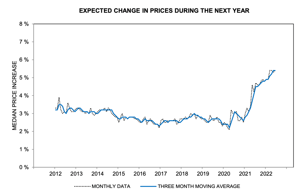 Longer-term expectations in the next chart have also moved higher over this period but to a lesser degree. Recent readings are roughly ½ percentage points above the level that characterized the period before 2021. The Fed tends to focus on longer-term expectations of inflation as the more important driver of inflation and evidently was concerned about the upturn in the most recent survey (the dotted black line). While longer-term expectations of inflation play an important role in the inflation process, one should not overlook the information contained in shorter-term measures, which have moved up most sharply recently.