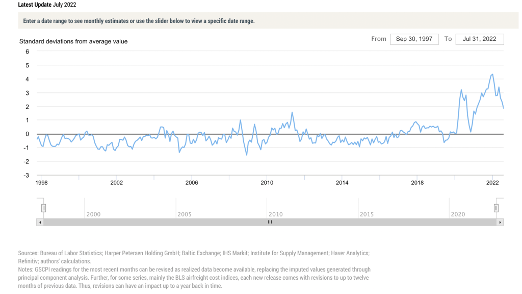 Supply chain pressures have contributed to price increases over the past couple of years and will be complicating the interpretation of monthly consumer price data. The New York Fed’s Global Supply Chain Pressure Index, shown below, has been heading downward over recent months. To the degree that this moderation is causing smaller price increases, there is a risk that smaller increases in core prices will be misread as a slowing in underlying inflation instead of one-off declines.