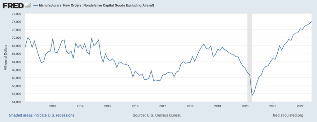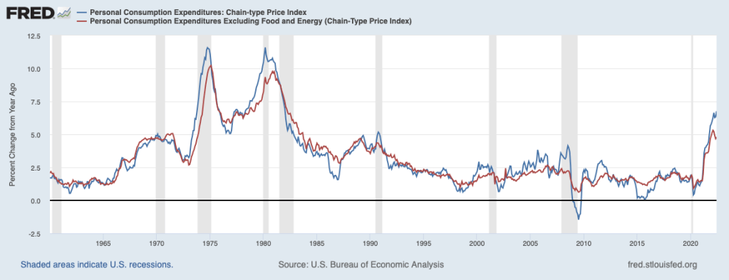 Turning to the Fed’s preferred measure of consumer prices (the Personal Consumption Expenditures Index) shown in blue in the chart below, headline inflation reached 6.8 percent over the twelve months ending in June (most recent data).