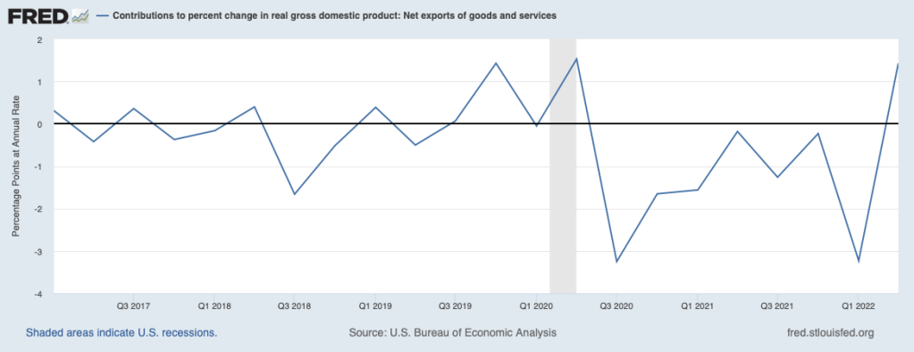 Some of the stronger demand for capital goods is coming from supply-chain disruptions that are causing many U.S. firms to diversify sources of supply and increase their reliance on U.S. suppliers; those domestic suppliers are increasingly finding it worthwhile to invest in more capacity to meet the rising demand. Also favoring the demand for U.S. goods and services should be the external sector. Shown below are contributions to growth in real GDP from net exports.