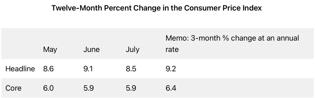Shown in the table below are twelve-month percent changes in both headline and core CPI inflation. On a twelve-month basis, headline inflation slowed from 9.1 percent to 8.5 percent. However, core inflation was unchanged at 5.9 percent. Moreover, the annualized rate of price change over the three months ending in July was 9.2 percent for the headline CPI and 6.4 percent for the core CPI. Placed in perspective, these data suggest that it might be premature to celebrate the end of inflation.