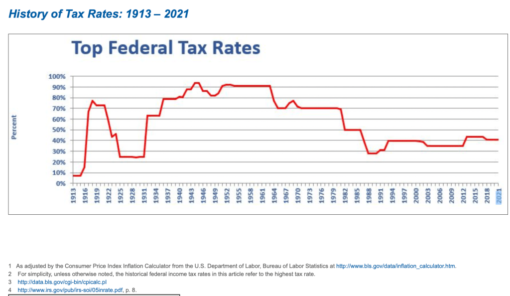 A notable feature of the personal income tax is its progressivity. The initial individual income tax in 1913 imposed tax rates that ranged from 1 percent to 7 percent, with tax rates rising as income increased. This can be seen in the chart below that has the highest marginal tax rate for each year from 1913 to 2021.