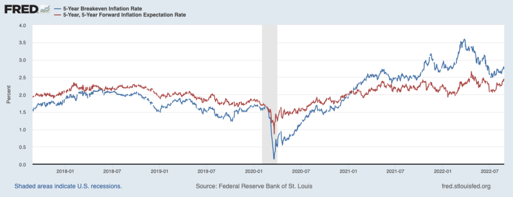 Still another measure of longer-term inflation expectations can be derived from the Treasury securities market. Shown next are five-year ahead expectations of CPI inflation (blue line) and five-year expectations of CPI inflation for the period starting five years from now (red line). These charts show that Treasury market measures of longer-run expectations, too, have moved a little above the pre-2021 period associated with low inflation. Chair Powell had a different take on this evidence when he said, “Today, by many measures, longer-term inflation expectations appear to remain well anchored.”