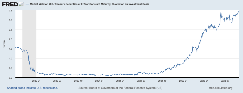 All of the above points to a big job ahead for the Fed in the period ahead—bigger than what the Fed and financial markets have come to foresee. The current situation implies that the Fed must bring aggregate demand below aggregate supply for a while to get underlying inflation on a downward path. Once the back of inflation has clearly been broken, inflation expectations and inflation momentum will diminish. To get to this point, short-term interest rates will need to rise above underlying inflation (around 5 percent currently) for a time. Market participants have slowly come to appreciate that interest rates need to be higher—as shown in the next chart showing the interest rate on the two-year Treasury note. But, at 3-1/2 percent, rates still have a ways to go before they will be applying sufficient restraint on the economy to successfully return inflation to the 2 percent target.