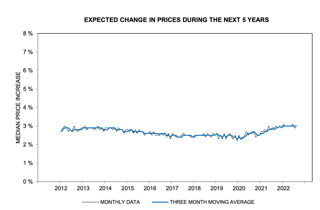 Much the same can be said of consumer expectations of longer-term inflation expectations, shown in the following chart. The extent to which consumer expectations of inflation have moved outside the earlier range is smaller than for professional forecasters.