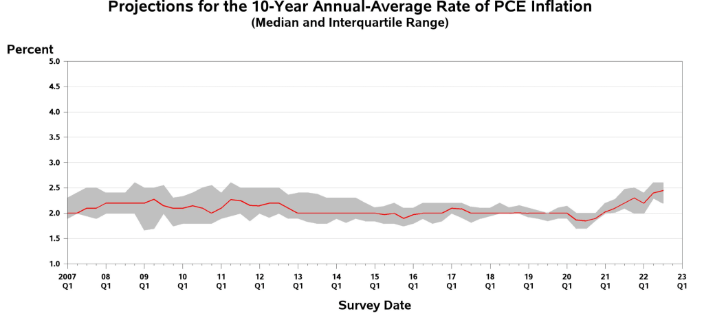 The next chart presents the long-term inflation expectations of professional forecasters. Over the past year, those expectations have moved further above the range that characterized the low inflation period that preceded 2021.
