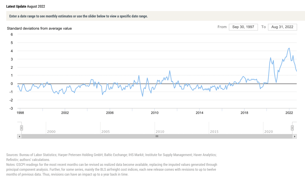 Digging more deeply, the upturn in core inflation owed to a further increase in service price inflation (excluding energy services, the purple line in the chart above) and an uptick in core commodity price inflation (the green line) after several months of moderation. Both service price inflation and core commodity price inflation had been steady and very subdued before the spring of 2021. The increase in core commodity price inflation into early 2022 is owed in part to intensifying supply-chain pressures, shown by the New York Fed’s Global Supply Chain Pressures Index in the next chart. However, the recent uptick in core commodity price inflation occurred despite the easing in supply-chain pressures since earlier this year.