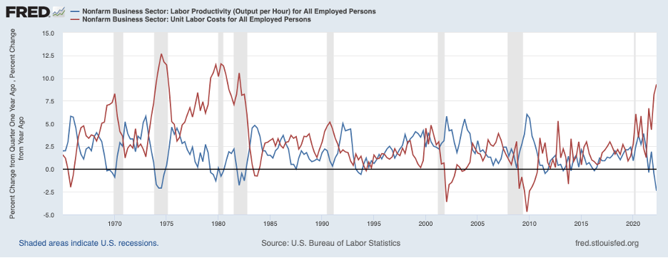 A story that has not gotten a lot of attention is the recent weakness in labor productivity and its implication for pressures on labor costs. The blue line in the chart below shows that growth in labor productivity has been very low or negative in recent quarters. Weakness in productivity has contributed to the surge in unit labor costs, the red line. Sluggish productivity may owe to COVID-related telecommuting and the enlarged rate of job turnover as workers respond to better opportunities resulting from plentiful job openings. These factors affecting productivity would appear to be temporary, but the longer they persist and contribute to inflation, the greater the chance they will contribute to momentum in the inflation process.