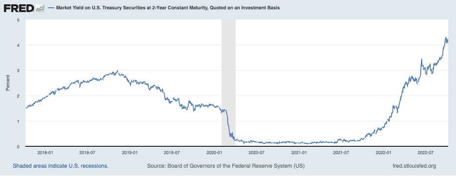 Market participants have come to expect more Fed tightening, too. The next chart shows the yield on the two-year Treasury note, which has risen from around 25 basis points in September 2021 to the 4-1/4 percent area most recently.
