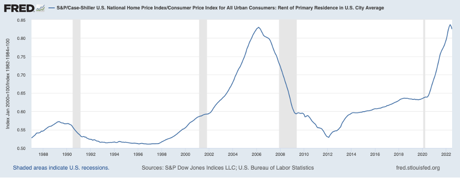 This run-up lifted the ratio of home prices to rents—the next chart—to the territory last reached during the home price bubble of the first half of the decade of the 2000s.