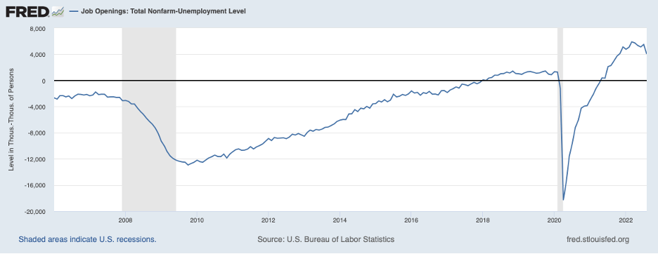 The most recent report on job openings indicates that the overhang of openings in excess of the number of unemployed—shown in the chart below—remains historically large despite a small narrowing in August.