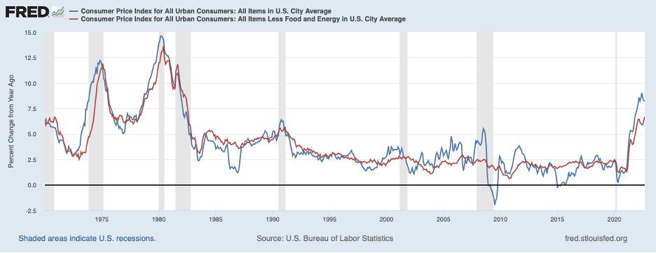 The Consumer Price Index (CPI) for September all but guaranteed that the Fed on November 2 will hike the federal funds rate another 75 basis points to 3-3/4 to 4 percent from its current 3 to 3-1/4 percent. As shown in the chart below, headline inflation—the blue line—stayed above 8 percent in September while core inflation (excluding food and energy prices)—the red line— rose to 6.7 percent, the fastest pace in forty years.