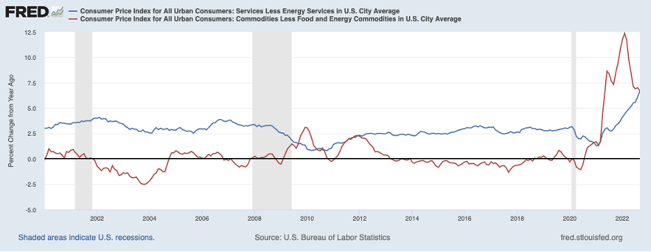The September CPI data further confirmed that high consumer price inflation has developed a momentum that will be hard to reverse. Price increases were widespread and service prices, the blue line in the chart below, continued to accelerate in September even as commodity-price inflation moderated further.