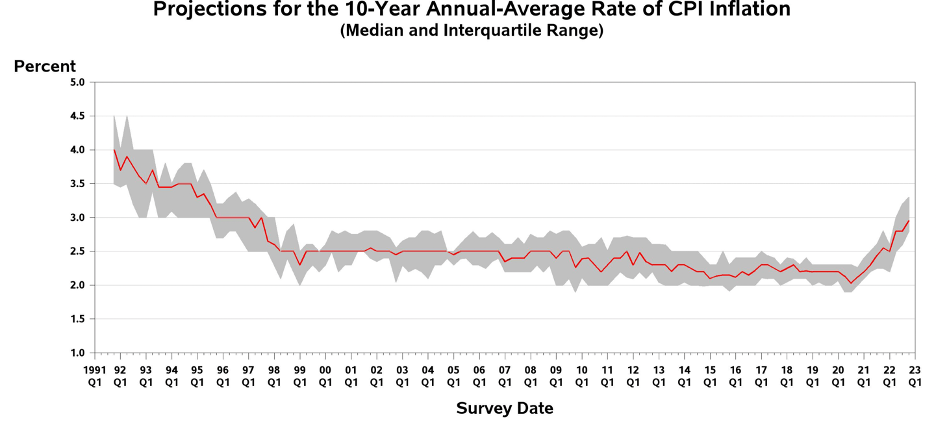 Previous experience with efforts to bring down high inflation clearly indicates that there is a persistence factor in the inflation process once inflation has passed a threshold and that momentum factor is hard to overcome. Breaking that momentum will require that interest rates rise above the underlying rate of inflation and stay there for a time. Looking at present circumstances, this reasoning implies that the federal funds rate will need to be raised to a good bit above 5 percent and remain there for a while before we will see inflation on a distinctly downward trajectory. Professional forecasters point to a tough battle ahead for the Fed regarding long-run inflation expectations, shown in the chart below. These forecasters have been raising long-term inflation forecasts for more than a year and now see the long-run inflation outlook to be higher than any period since the late 1990s.