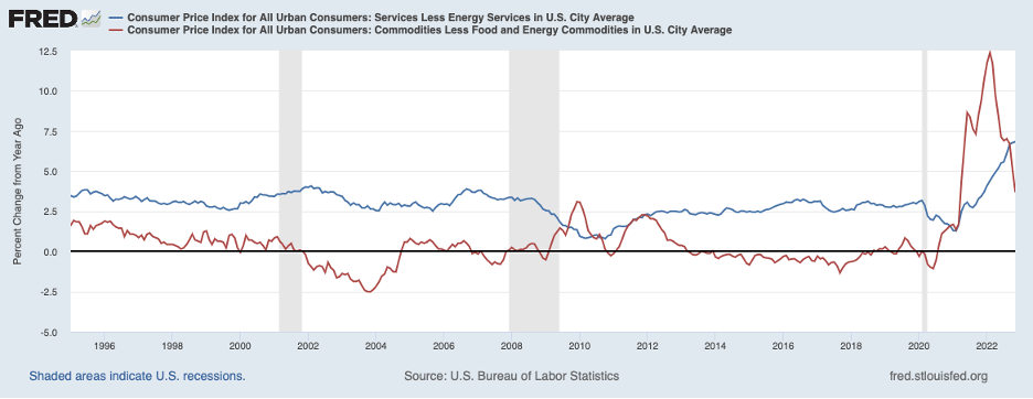 Digging a little deeper, deceleration in the CPI has been most evident in commodity prices. The red line in the chart below shows the twelve-month change in the prices of commodities (excluding volatile food and energy commodity prices), which have slowed from 12.4 percent in February to 3.7 percent in November. Supply chain disruptions had been boosting commodity prices, but these disruptions have been reversed to a great extent since earlier in the year. That reversal of supply chain disruptions has placed temporary downward pressure on commodity prices. How much longer the easing of supply constraints will be putting downward pressure on commodity prices is unknown at this point.