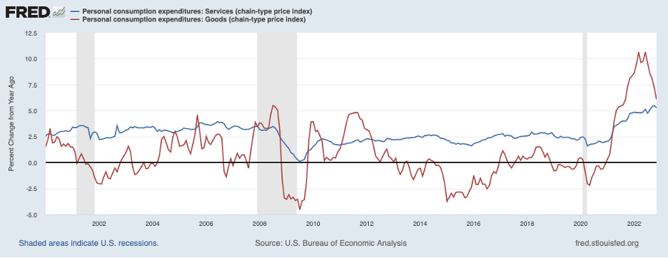 Digging more deeply, goods price inflation, the red line in the next chart, has moderated considerably while service price inflation, the blue line, appears to have stabilized in recent months around an elevated 5 percent rate.