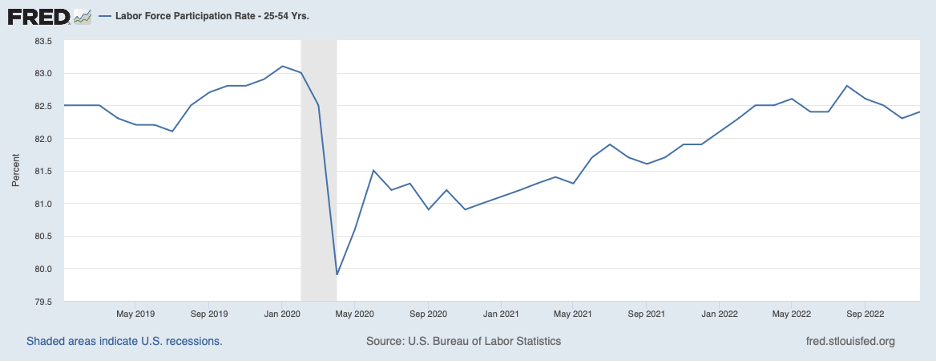 Looking ahead, it is unlikely that inflation relief will come from the supply side. Notably, many workers have decided to sit on the sidelines and not return to the workforce. The next chart shows that the participation rate on the part of prime-age workers recovered partially in the first two years of the pandemic but has since leveled off at a rate well below the pre-pandemic level.