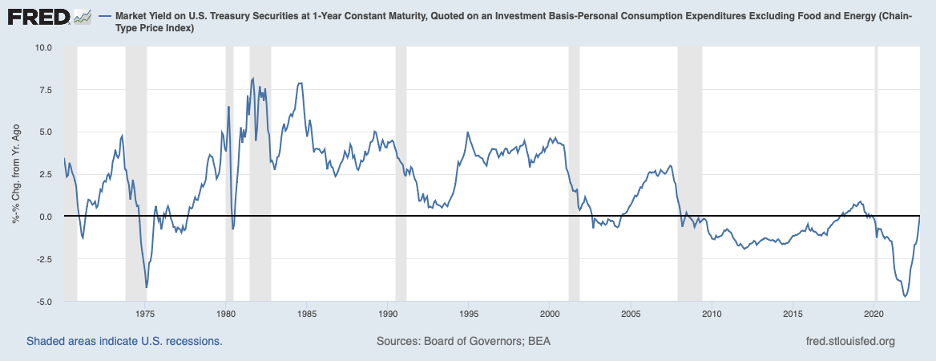The next chart shows the real one-year Treasury yield—the nominal one-year yield less the underlying rate of inflation (core PCE inflation). The real yield over the past year has gone from being deeply negative to zero, meaning that the amount of monetary stimulus coming from the Fed has been reduced substantially. (Note that the one-year Treasury yield embodies market expectations for the federal funds rate over the next year; currently, market participants envision that the Fed will raise the federal funds rate by ½ percent or so over the first half of 2023 and then begin to reverse these increases later in the year.) Nonetheless, at a real interest rate of zero, the Fed is still providing monetary stimulus. The level of the real interest rate that is associated with neither monetary stimulus nor restraint—the so-called neutral rate—is on the order of ½ to 1 percent.