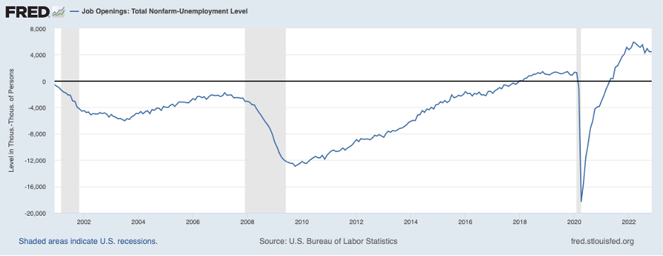 This excess of demand over supply was also reflected in the labor market. The chart below shows the excess of job openings over the number of unemployed persons, which became pronounced in early 2022 and remained so over the remainder of the year (up to November, most recent job openings data).