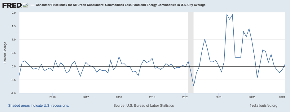 Dissecting the data further, commodity prices, the next chart, had declined in some previous months from an easing of supply-chain restraints but turned up in January. As the impact of the unwinding of supply chain restraints fades further, commodity price inflation can be expected to pick up some more.