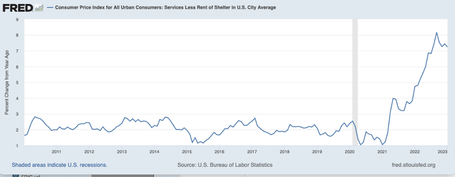 Moreover, many analysts, including some policymakers at the Fed, regard service prices apart from housing costs to be a good indicator of underlying inflation at present when special factors are distorting prices of commodities and housing costs. The next chart shows prices of services excluding the rent of shelter through January. This measure of consumer price inflation remained very high into early 2023 and most likely is getting a boost from wage pressures coming from a very tight labor market for service workers.