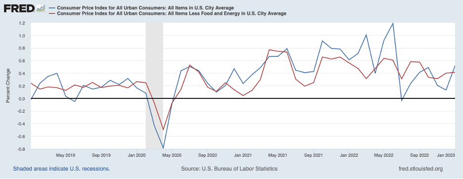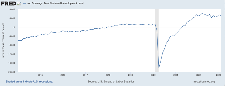 Based on the above, it is reasonable to conclude that underlying inflation has not moderated much from its peak several months ago. Contributing to current inflation is the continuation of tight product and labor markets. The chart below shows the excess of job openings over the number of unemployed persons through January (most recent data). The chart indicates that the substantial excess demand for labor continued into early 2023.