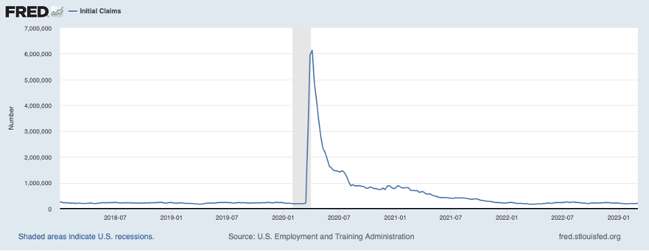 More recent news on the labor market comes from the February jobs report and initial claims for unemployment insurance, the next chart. The February jobs report showed that employment growth was brisk again last month and initial claims through early March continued to run at historically very low levels.