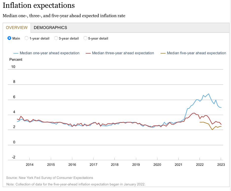 Also contributing to inflation momentum are inflation expectations. As noted in a recent commentary (see February 13, 2023 post, Fed Policy: The Importance of Vigilance), longer-term inflation expectations have moved only a little higher in the last couple of years—likely reflecting the Fed’s repeated insistence that it won’t end policy restraint until it is sure that inflation is on a path back to 2 percent. Two survey measures of longer-term inflation expectations are shown in the chart below.