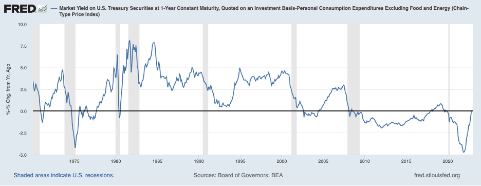 It is worth noting that monetary policy has not become restrictive yet—that is the real federal funds rate remains below the neutral rate. The next chart shows a measure of the real federal funds rate—the nominal federal funds rate less the twelve-month percent change in the core PCE consumer price index. This measure was a shade above zero in January (most recent data available for the core PCE index), still notably below the neutral rate for the real federal funds rate of around ½ to ¾ percent. Said differently, the Fed will need to raise its target for the federal funds rate by roughly another ½ percent to reach neutral (the measure shown does not reflect the ¼ percent increase announced on February 1).