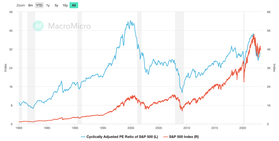 Although market pricing has gotten closer to where it needs to be for inflation to be on a clear downward trajectory, it still has some distance to go. This reasoning implies that longer-term interest rates will need to increase further and the slump in equity prices has further to go. The chart below shows the S&P 500 stock price index (red line) and a price-earnings (P-E) ratio that has been adjusted for the economic cycle. Stock prices have fallen about 15 percent from their peak a little more than a year ago and so has the cyclically adjusted P-E ratio.