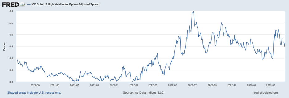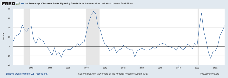 Nonetheless, the March banking disturbance likely has left an imprint in the form of more caution among banks. Commercial banks have been boosting their cash assets to better prepare for a loss of deposits and likely have also tightened their underwriting standards for making loans. The chart below shows the change in lending standards by larger banks for loans to smaller businesses through January of this year (most recent data). These banks had been tightening standards for small business loans prior to the March banking disruption (a similar pattern is displayed for loans by these banks to intermediate- and large-sized firms). In addition, banks may be reducing the amount that they lend to many of their customers and may be raising the rates that they charge (over and above benchmark interest rates).