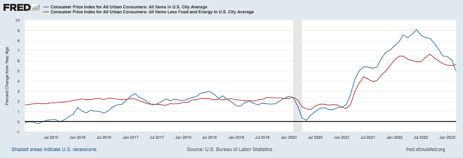 Meanwhile, the news on consumer prices suggests that inflation remains stubbornly high. The chart below plots the twelve-month percent change in the headline CPI (blue line) and in the core CPI (excluding food and energy prices, red line). Headline inflation cooled to 5 percent last month, largely owing to a temporary decline in energy prices (which has since been reversed). But core inflation stayed in the 5-1/2 percent area. Moreover, core inflation showed little evidence of fading over the three months ending in March.