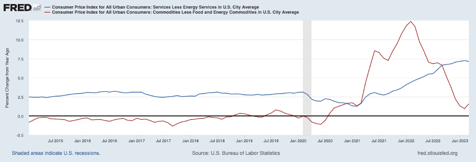 Breaking things down further, the decline in commodity price inflation appears to have come to an end as shown by the red line in the following chart. The ending of commodity price disinflation likely owes to the unwinding of supply-chain disruptions drawing to an end. More worrisome, service price inflation, likely more indicative of underlying inflation pressures, has not slowed and remains about 4 percentage points above its pace prior to 2021.