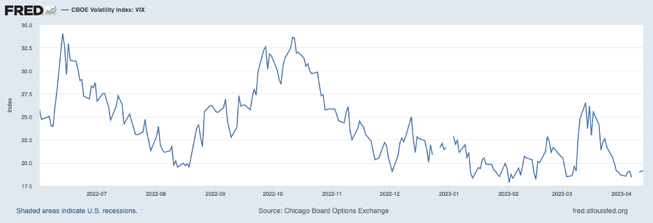 The drama over these banks and concern about wider-spread problems in the banking sector unsettled financial markets. As shown in the chart below depicting a market measure of prospective stock market volatility, uncertainty about prospective market volatility spiked in the wake of the SVB debacle, but not outside of recent experience. Moreover, prospective volatility retraced all of its earlier upward movement in the wake of measures taken by the federal government and by the absence of new difficulties emerging at other banks.