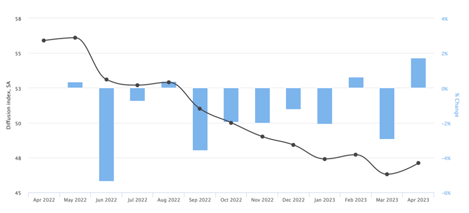 Market participants seem to be basing their outlook for Fed policy on a view that the economy is weakening and that the banking shock that hit in early March would cause further weakness as banks responded by tightening appreciably their provision of credit to businesses and households. The views of market participants were shaped to a degree by ongoing reports of weakening in the manufacturing sector as shown by the PMI index of the Institute of Supply Management, shown below. The index dropped below 50 — the level that represents no expansion or contraction in manufacturing — last September and has remained in contractionary territory since that time.