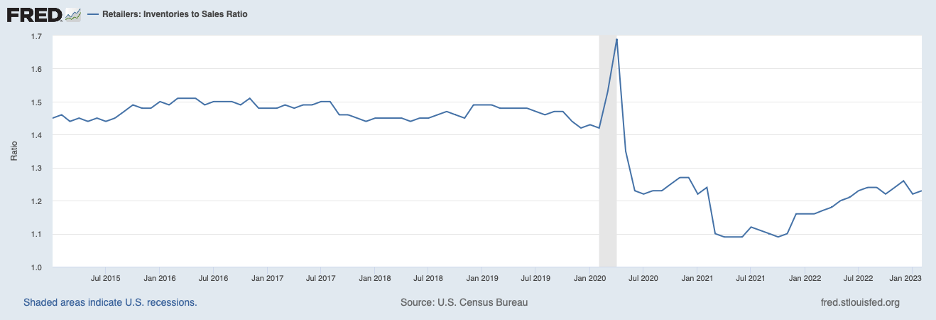 To assess the underlying strength of the economy going forward, it is noteworthy that growth in consumer spending and federal outlays for goods and services were robust in the first quarter. Contributing to the slowdown in real GDP growth was a drawdown of business inventories that shaved more than 2 percentage points off output growth. Looking ahead, inventories remain low in relation to sales at the retail level, shown in the next chart. Also, manufacturers of capital goods still have a sizable backlog of unfilled orders to keep their production levels up. As a consequence, it seems unlikely that the drag on GDP growth coming from inventories will persist while consumer and federal spending continues to propel the economy forward.