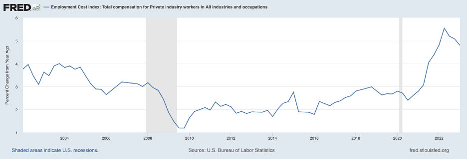 Turning to the labor market, the excess of labor demand over supply remained substantial through March (most recent data), as suggested by the chart below showing job openings less the number of unemployed persons. While the excess of job openings has shrunk a bit this year, the margin remains very large and is placing upward pressure on labor costs as illustrated in the next chart showing the growth of labor compensation for private sector workers. Growth in compensation remains roughly 2 percentage points above the pace before the COVID shock — a time when inflation was under control. Moreover, labor market data for April indicate that conditions in the labor market have not cooled much recently.