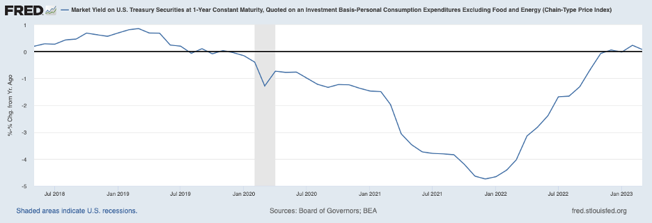 The Fed’s May 3 action raised the federal funds rate to 5 percent (actually, to a 5 to 5-1/4 percent range), 5 percentage points above the level fourteen months ago. Nonetheless, real short-term interest rates are barely positive, shown next, and remain below the level that will be required to break the back of inflation. The chart is based on the one-year Treasury yield less the twelve-month percent change in core PCE inflation through March. (The one-year Treasury yield in March reflected the expectation that the Fed would raise its target ¼ percent in early May —which the Fed did — but not anymore after that move and thus the March reading of the real short-term rate is reasonably reflective of the current level.) To restrain the economy sufficiently to turn underlying inflation lower will require further increases in the federal funds rate — likely a full percentage point or even more.