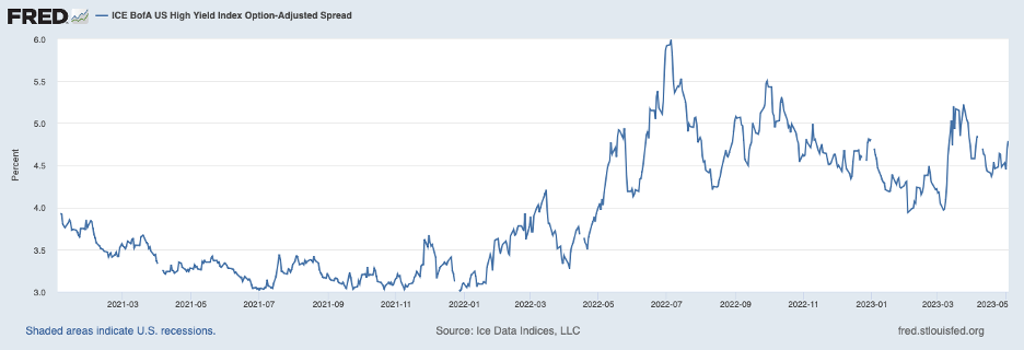 At this point, it is not clear that the banking disturbances have had a substantial separate impact on credit conditions. One rough indicator is the spread on below-investment-grade bonds, shown below. This measure of credit risk jumped higher when the banking disturbance hit in early March of this year but not to levels that emerged once the Fed began tightening in the spring of 2022. Moreover, it has since retraced much of the recent increase.