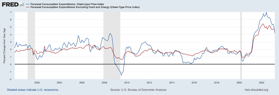 As shown in the chart below, inflation remained elevated through March (most recent data), especially core PCE inflation (the red line). Core inflation, a better indicator of underlying inflation than headline inflation (the blue line), has not slowed much and has stayed above a 4-1/2 percent rate through March — well above the Fed’s 2 percent target.