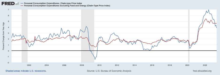 To date, the news on inflation does not point to relief. Shown in the chart below is headline PCE inflation (the blue line) and core PCE inflation (excluding volatile food and energy prices, the red line). The latter provides a better reading on underlying inflation. While headline inflation continues to recede, owing to declines in energy prices, core inflation has remained steady and well above the Fed’s 2 percent target.