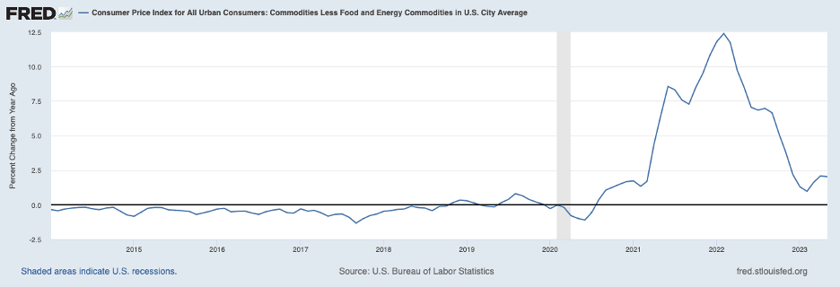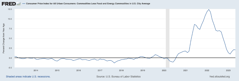 Moreover, it appears that the downward pull on headline and core measures of inflation coming from the impact of an easing of supply chain pressures on commodity prices has come to an end. The next chart shows that the dramatic drop in commodity price inflation (which excludes food and energy prices) has come to an end and commodity price inflation is outpacing pre-COVID rates by a sizable amount.