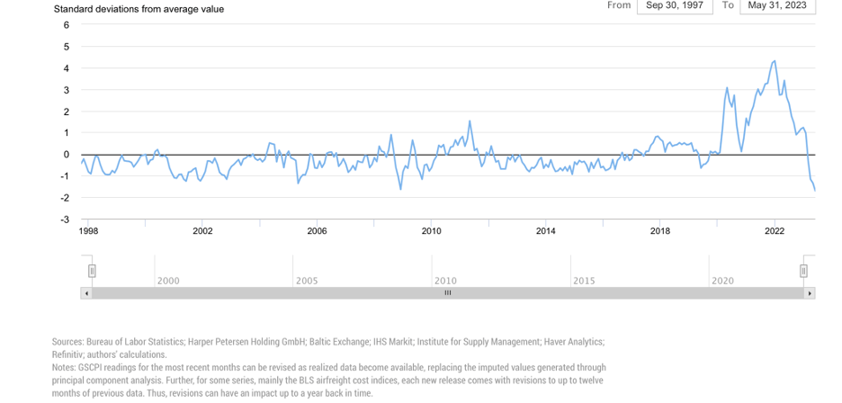 The intensification of supply chain pressures during the pandemic contributed to a surge in goods price inflation and the reversal of those pressures starting in the second half of 2022 acted to depress commodity price inflation.