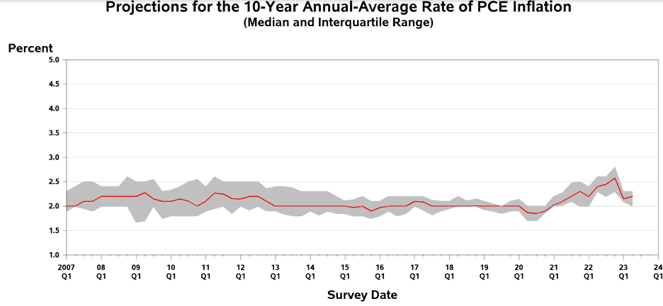 There is a silver lining in these clouds: The real interest rate will not need to rise as much as it did in the early 1980s to achieve victory in the battle against inflation. In part, this is because, as noted, the natural real rate of interest is now lower than in the early 1980s. Perhaps more important is expected inflation, especially longer-term expected inflation, which has not risen much above the Fed’s 2 percent target. Shown in the next chart is the median expectation for average inflation over the next ten years on the part of professional forecasters. Longer-term inflation expectations had drifted higher over 2021 and 2022 with actual inflation but retraced much of that increase over the first half of this year. Inflation expectations need to be anchored around the Fed’s 2 percent target for actual inflation to hold around a 2 percent rate and the chart shows that we are not far away from that point.