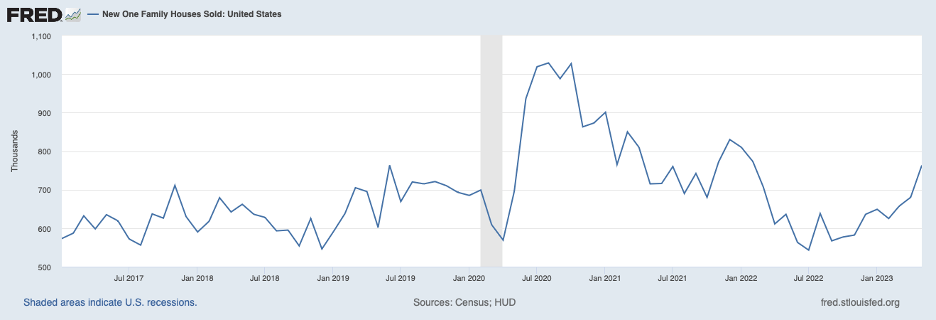 The evidence: One indication that the Fed’s job is not close to being finished can be found in the housing sector. Historically, housing has been among the most responsive sectors of the economy to monetary policy actions—throttling down when the Fed is tightening and swinging up when the Fed is easing. The chart below, showing sales of new homes, illustrates that new home sales dipped in the wake of the onset of Fed tightening in 2022 but have turned up over recent months to reach a level in excess of the pre-COVID period. Looking ahead, the housing sector will need to slow from its recent pace to perform its typical role in relieving pressure on resources and inflation. (Existing home sales have displayed a somewhat similar pattern to new home sales, but the upturn recently has been less pronounced reportedly because of the low inventory of existing homes available for sale.)
